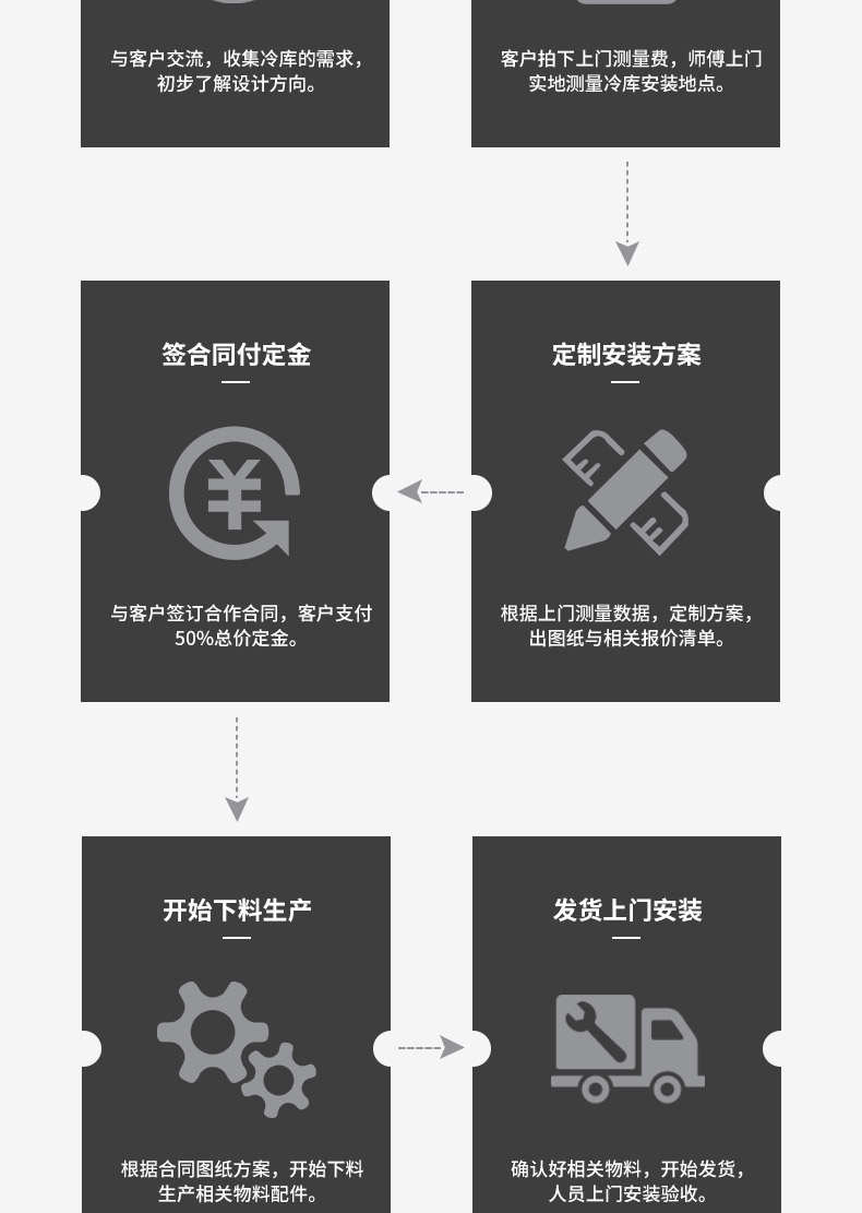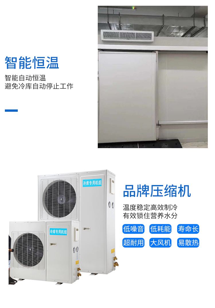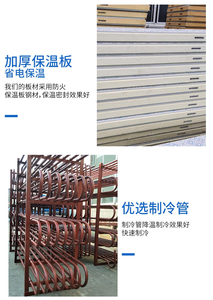 活動冷庫由聚氨酯冷庫保溫板、冷庫門、制冷機組、連結銅管、庫內(nèi)蒸發(fā)器(排管、吊頂冷風機)、溫度控制系統(tǒng)、庫燈、膨脹閥等配件組成。