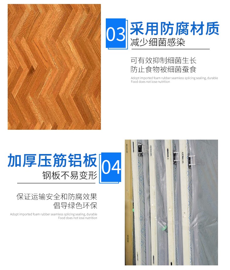 保溫庫板有:聚胺酯和聚丙乙烯,保溫板表面板材有不銹鋼板,鋁板,彩鋼板,鍍鋅板和玻璃鋼。