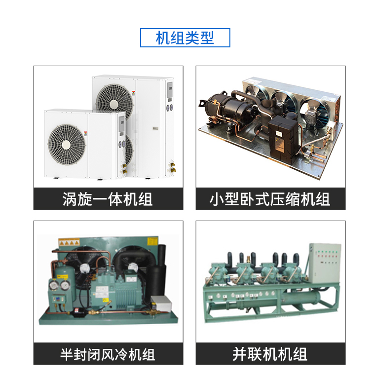 制冷設備有:制冷壓縮機組,又分半封閉機組、全封閉機組,開啟式機組;冷卻方式分風冷、水冷;制冷劑用氟利昂、無氟新型環(huán)保制冷劑、氨制冷。