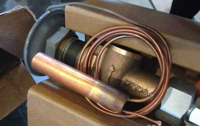 熱力膨脹閥實現(xiàn)冷凝壓力至蒸發(fā)壓力的節(jié)流,同時控制制冷劑的流量;它的體積雖小,但作用巨大,它的工作好壞,直接決定整個系統(tǒng)的工作質(zhì)量,以最佳的方式給蒸發(fā)器供液,保證蒸發(fā)器出口制冷劑蒸汽的過熱度穩(wěn)定,感溫包必須與壓縮機的吸氣管良好的接觸從而準確的感應(yīng)壓縮機的吸氣溫度,通常充注著與制冷系統(tǒng)內(nèi)部相同的制冷劑,